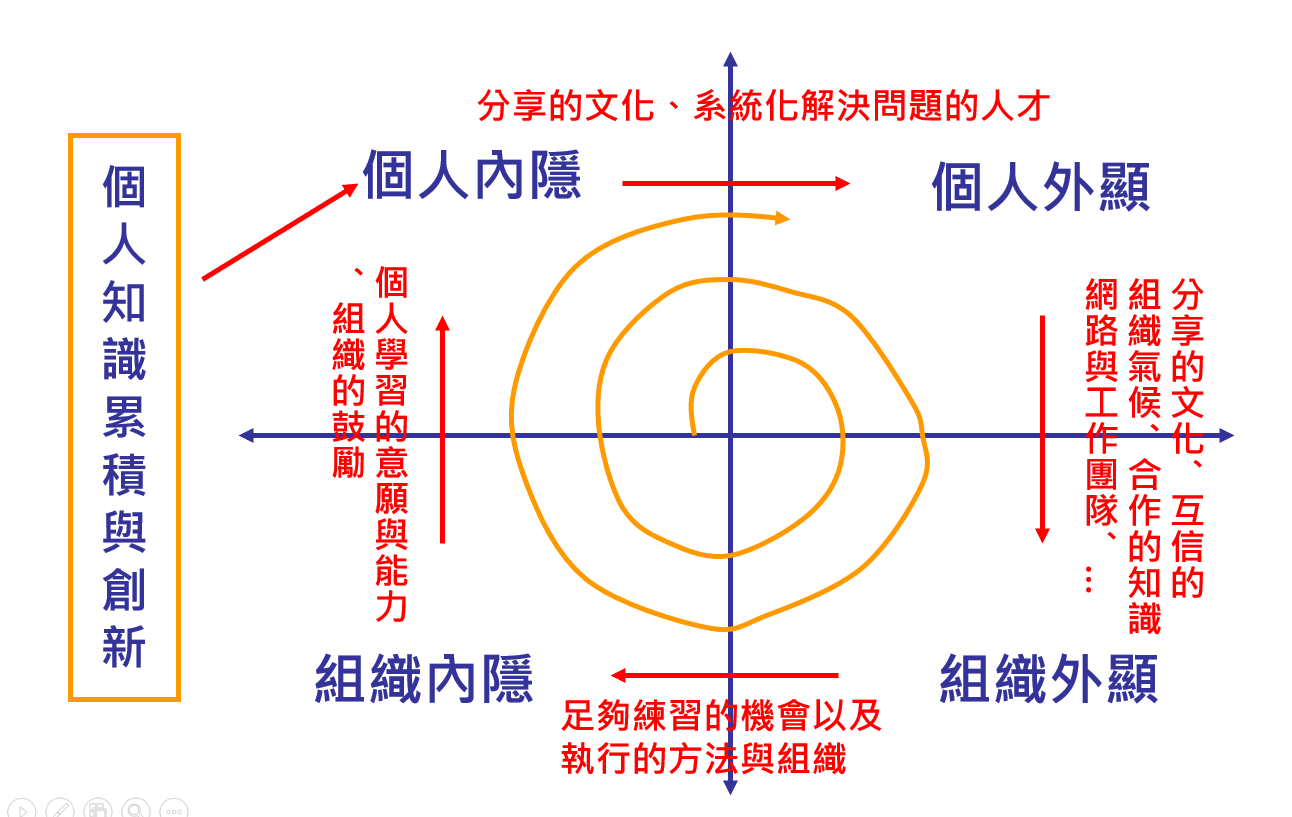 圖一闡述個人將所習得的新知識藉由內隱知識外顯化、並藉由與組織內的其他人互動將個人外顯化的知識傳遞給組織的其他人,成為組織的外顯知識、組織再藉由實際的操演,將組織外顯的知識內化為組織內的行為模式、習慣與組織的共同語言;這四個步驟說明如下: