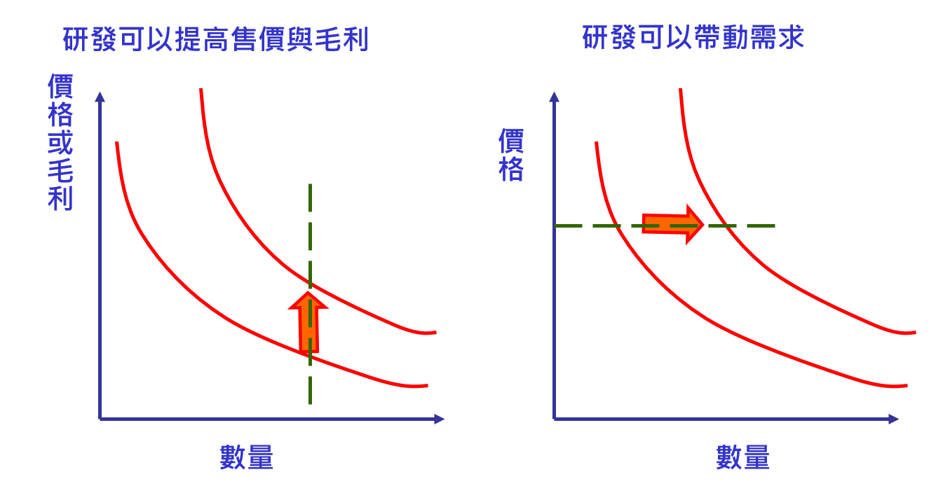 企業從事研究發展可以擴展企業產品線的廣度與深度,或者為企業帶來新的產品或市場發展方向,接替或延續產品的生命週期,以保持企業的成長活力;因此,企業從事研究發展可以延續企業的生命、獲得更高的經營彈性、開發新的市場、提高產品的價格或毛利、提高產品的銷售量、…等等。