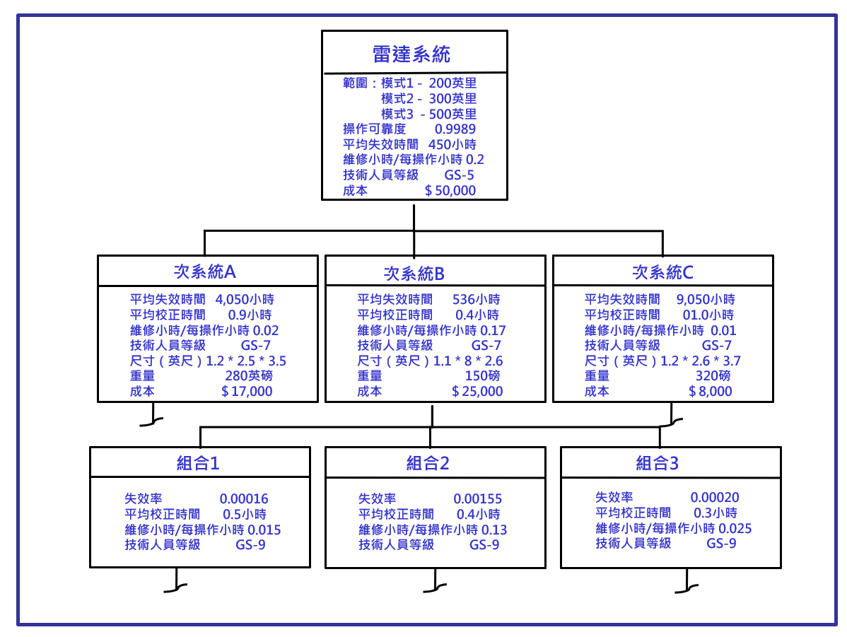 在進行產品分解架構(PBS)與工作分解架構(WBS)之時,另一項重要的工作則為系統規格的擬定與規格的下放(allocation);在沒有前例可循時,這是一項艱難的工作,需跨領域的團隊透過大量的模擬、分析、雛形件測試、…等等工作才得以完成;圖十為雷達系統規格與規格的下放(allocation),雷達統的規格參數複雜,這裡就不詳細討論;但我們可以看一下成本這一項,雷達系統的總成本為5萬美金,而次系統A的成本為1.7萬美金、次系統B的成本為2.5萬美金、次系統C的成本為0.8萬美金,三個次系統成本的加總正好是5萬美金,這就是將成本下放(allocation)的意涵。